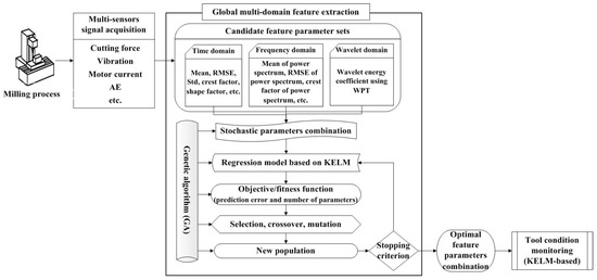 Multisensors can provide more information related to the tool condition, but they increase the risk that effective information will be overwhelmed by redundant information. Thus, obtaining the most effective feature information from multisensor signals is currently a hot topic. In this paper, a multisensor global fusion method for TCM in the milling process is researched. Several statistical parameters in the time, frequency, and time–frequency domains of multiple sensors are selected as an alternative parameter set. The monitoring model is executed by the Kernel extreme learning machine (KELM), and the genetic algorithm (GA) is applied in order to search the optimal parameter combinations to achieve the highest prediction precision. The remainder of this paper is organized as follows: Section 2 reviews the literature of multisensor feature extraction in TCM for the milling process. Section 3 describes the theoretical framework and the learning algorithm of our proposed method. Section 4 describes an experiment with an open data set of the tool condition in order to compare the proposed method and several current feature extraction methods. Conclusions and suggestions for future work are given in Section 5.
