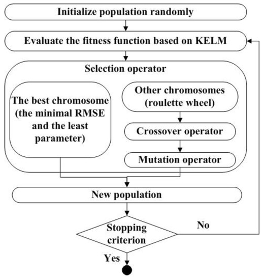 In Figure 2, the fitness function is the RMSE with the training set using KELM. Obviously, a high RMSE indicates a low fitness, and those individuals with greater fitness will have a greater probability of being selected for recombination. The selection operator divides into two parts. The first part is the best chromosome that has a minimal RMSE and the lowest number of parameters, and that can solve the second objective in Equation (6). The other part selects the individuals according to their fitness level using the roulette wheel method. The crossover operator and the mutation operator recombine the selected individuals in order to generate a new population with a preset crossover rate Pc (the chance of crossover being applied to a chromosome) and mutation rate Pm (the chance of a chromosome being mutated). Finally, the iterations are completed when the number of iterations reaches the preset maximum iteration value.