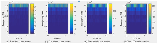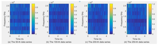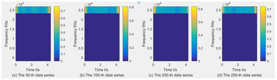 where denotes the wavelet packet coefficients of signal x(t) and wj,k(t) are the wavelet packets localized at 2jk in the scale 2j, and L is the level of the WPT (here, L = 3). Taking the C1 sample as an example to show the wavelet time–frequency diagrams through WPT using db1, due to limited space, three wavelet time–frequency diagrams with the X-dimension force, X-dimension Vibration, and AE are listed in Figure 4, Figure 5 and Figure 6. It can be found that the maximal wavelet coefficients of the X-dimension force in the C1 training sample are enhanced with the increase of tool wear, while that of other two sensors showed no obvious trend of change.