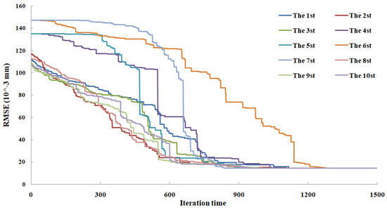 In the proposed GA–KELM-based global feature extraction algorithm, the input parameters used are summarized in Table 4. The optimal process of the objected function was run 10 times, and the iterations of optimal solutions are shown in Figure 7. It can be shown that the optimal result was obtained when the iteration was run about 1000 times.