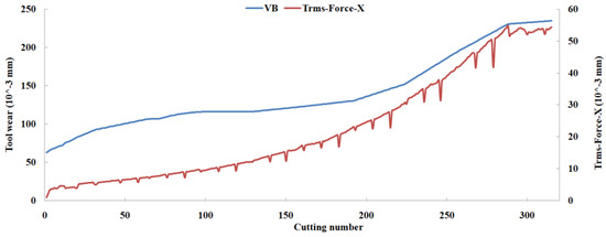 Eleven feature parameters were selected as the optimal feature parameter set, which involved two sensor channels, Trms, Fcf, Fsb, Fkb, E1, E2, E3, E5, and E6 in the X-dimension Force, and Tsd, and Tcf in the Z-dimension Force. Figure 8, Figure 9, Figure 10, Figure 11, Figure 12, Figure 13, Figure 14, Figure 15, Figure 16, Figure 17 and Figure 18 show the scatter diagrams between these feature parameters selected and tool wear value (VB) with the C6 testing set. It can be seen that four feature parameters have no obvious correlation with the tool state, that is, Fcf, Fsb, Fkb in the X-dimension Force, and Tcf in the Z-dimension Force. This demonstrates that the parameters related most strongly to the tool state could not obtain the highest prediction accuracy, that is to say, not every parameter is strongly related to tool state in the optimal parameters corresponding to prediction accuracy.
