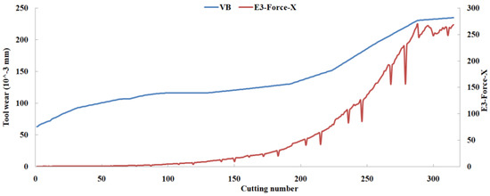The scatter diagram between E3 in X-dimension Force and tool wear value.
