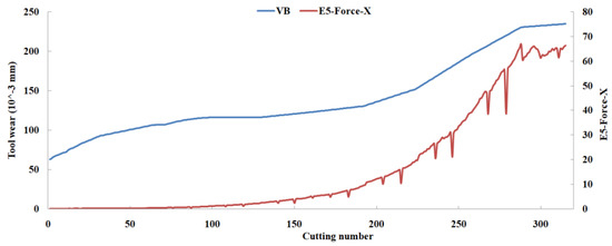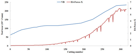 The scatter diagram between E6 in X-dimension Force and tool wear value.