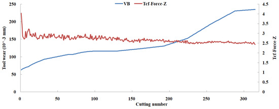 The scatter diagram between Tcf in Z-dimension Force and tool wear value.