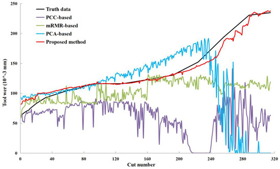 The predicted tool wear values with the C6 testing set are shown in Figure 19. It was found that the overall error of the predicted tool wear was small, and the proposed method could reveal the trend of the tool wear state well. In addition, three benchmark methods, PCC-based, mRMR-based, and PCA-based, were compared with the proposed method. The PCC [24,47,48], mRMR [34,35], and PCA [31,32] methods are often used to extract feature parameters or principal components in TCM according to linear or nonlinear correlation. In the PCC-based method, these feature parameters of the correlation coefficient with tool wear values above 0.8 were selected as the inputs of the KELM in this study, and 33 parameters were retained in the final features. In the mRMR-based method, 19 parameters were selected in the final features by considering the maximum relevance and the minimum redundancy criterion simultaneously. In the PCA-based method, principal components were obtained through solving the eigenvalues of the correlation matrix of training data. The cumulative contribution rate of the first 14 principal components reached 90.23%, and then the first 14 principal components were selected as the inputs of the KELM. The predicted tool wear values of the three methods with the C6 testing set are shown in Figure 16, and several performance indexes (RMSE and R2 with the truth data, the number of selected parameters, and the number of sensor channels involved) of the four methods are shown in Table 5. It can be shown that the proposed method outperforms the other three methods in terms of prediction accuracy and the number of selected parameters.