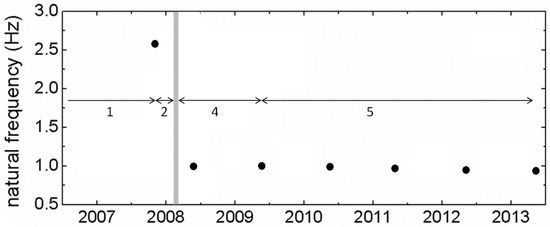 Previous discussion indicates that damage in the bridge occurred mostly in the interval 2007–2009. This damage is reflected (i) in a dramatic shift of the first lateral modal frequency of the bridge, from 2.6 to 1 Hz (Figure 2), which is much above any statistical error ([24] and Figure A2); (ii) in loss of stiffness of key structural elements, especially of its arch superstructure; (iii) in asymmetric structural damage (longitudinal splitting cracks around bolts in the southerly sides of the bridge).
