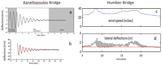 Semi-static and dynamic lateral oscillations in the Kanellopoulos and the Humber Bridge. (a) An example of forced, transient oscillation (shaded, left) followed by a free attenuation interval and an equilibrium interval (shaded, right) characterized by noise (after [2]); (b) The free attenuation interval in (a) (observed, black curve) approximated by an idealized curve (in red). Excellent match of the curves indicates a SDOF oscillation permitting accurate estimation of the first lateral modal frequency; (c) Wind record during an extraordinary wind event affecting the Humber Bridge, UK; (d) Recorded lateral deflections (deviations from red line) indicate a combination of semi-static bending with amplitude of up to 2 m and of dynamic high frequency oscillations produced by gusts, not shown in (c). (c,d) modified after Figure 17 in [5].