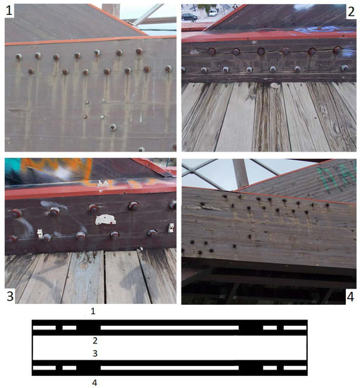 Recently, however, it was realized that strong winds produce a combination of semi-static and of dynamic deflections (Figure 3d; [5]). The impact of wind on smaller, timber bridges remains unknown, and only recently there has been presented evidence of wind-induced lateral deflections of a pedestrian bridge [17]. Furthermore, decay of the southern faces of the deck because loss of humidity due to uneven exposure to sun radiation and an overall material deterioration cannot be excluded, but it is unlikely to represent a dominant cause for observed damage only near connections.