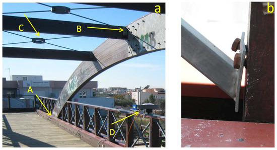 (a) Photo of the bridge during the 2007 survey, before damage was observed. Arrow (A) points to connections (2) in Figure 4, in which no signs of splitting are visible. Arrow (B) points to transversal roof beams, which appeared strongly coupled with the two arches. Arrow (C) points to metallic elements, unable to offer rigidity and which were sheared after 2009. Arrow (D) points to some of the collocated sensors (accelerometer, GPS, RTS reflector) used during the annual monitoring surveys; (b) A characteristic example of ice-extruded bolt; from a photo taken in 2009.