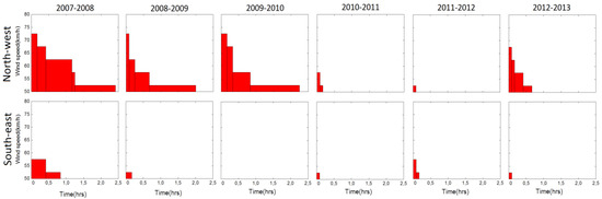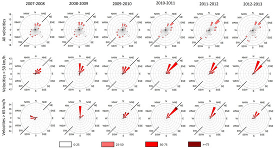 For this reason, we focused on the strong winds which occurred in this area and using the available data we compiled rose diagrams for significant (>30 min long) intervals with wind speeds above the thresholds of 50 km/h (approximately intensity 7 in the Beaufort scale, or 14 m/s) and of 65 km/h (18 m/s). These rose diagrams are summarized in Figure 6.