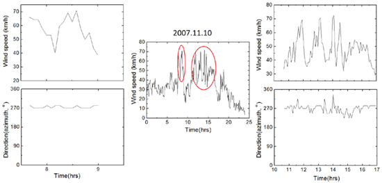 The analysis of the available wind record permits to recognize that the broader area is characterized by long intervals of no or of very low winds, interrupted by intervals of strong winds (typically above 40 km/h), occasionally lasting for up to three days. The intervals of strong winds are thereafter regarded as wind events, and sometimes included two or more sub-events. All these wind events were separately analyzed, and a representative example is shown in Figure 7. This analysis revealed that during a wind event the wind direction remained relatively stable (azimuthal variations of usually less than 10–20°), and the wind speed was also kept essentially above a certain threshold (Figure 7).