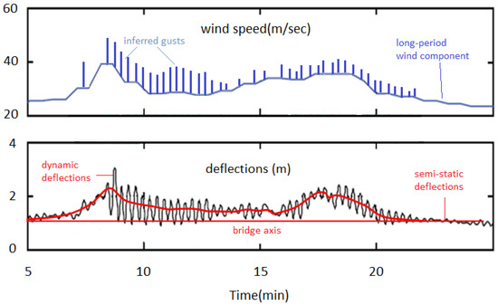 Wind excitation and lateral deflections of the Humber Bridge, UK, based on data of [5]. The time series of deflections imply a combination of semi-static deflections (due to the long-period component of wind), on which are superimposed dynamic deflections (with similar order of magnitude, amplitude up to 2 m) generated by gusts, schematically indicated in the top figure. A similar causative relationship between wind components and deflections is assumed for the Kanellopoulos Bridge as well.