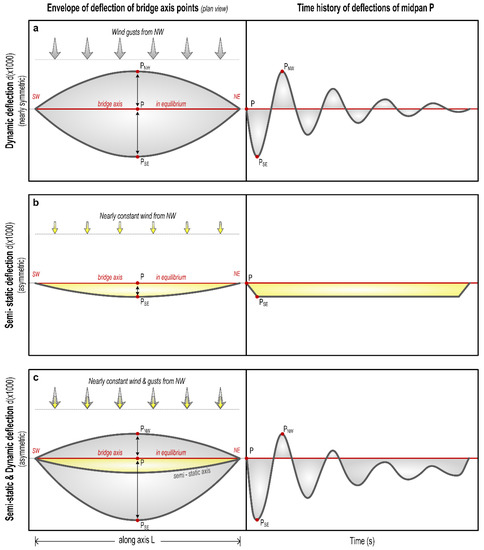 Conceptual model to explain asymmetric bending of the bridge main axis (and hence increased damage), as a result of loading by dominant northerly winds producing a combination of semi-static and dynamic deflections. Inferred from observations in the Humber Bridge (Figure 9) and from results of monitoring surveys. Left column indicates the envelope of all possible positions of the deforming bridge axis, right column the time series of deflections of the middle point. Upper row: Dynamic loading produces essentially symmetric deflections relative to the main bridge axis (when in equilibrium position). Middle row: Semi-static loading produces asymmetric deflections (in yellow). Lower row: The combination of semi-static and dynamic loading (gusts superimposed on nearly steady-state wind load) produces asymmetric deflections and strong stresses along the southern sides of the beams. Accumulation of such oscillations produced fatigue-induced cracks (longitudinal splits). This pattern corresponds to the deformation of the midspan of the bridge, 26.5 m long (see Figure 1).