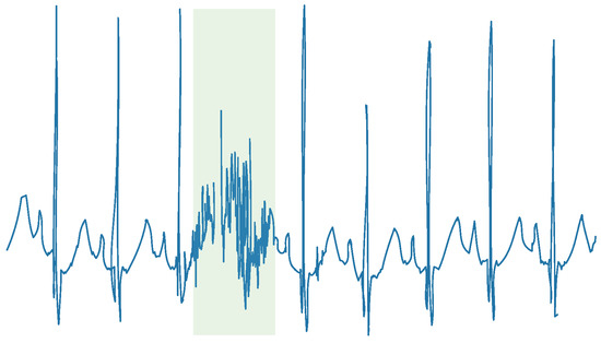 An example of an ECG trace with artifacts (colored band). An R wave cannot be detected due to artifacts.
