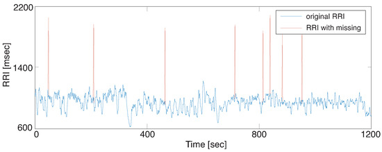 Missing RRIs were artificially introduced to the parameter optimization dataset and the validation datasets in a random manner as and eliminated . There were no successive missing RRIs, and the missing rates were , , and . Since the ordinal heart rate of a healthy adult is about 60–80 bpm, 1% missing means that R wave detection error occurs about every 1.5 min. Figure 3 illustrates an example of RRI data with which was generated from the RRI data of subject 16 .