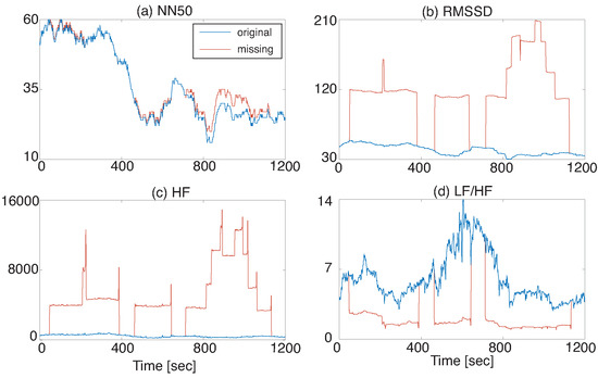 Some HRV features easily fluctuate when a missing RRI occurs even if it is just one. Figure 2a shows an example of RRI data with one missing and Figure 2b–d are RMSSD, NN50, and HF that were calculated from the RRI data of Figure 2a. A three-minute time window was used for HRV calculation. The vertical line denotes a missing RRI occurrence point. This example shows that some of the extracted HRV features were significantly altered when the R detection error occurred and that their influence lasted for three minutes in this case, which is the window size of HRV calculation.
