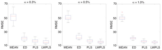 RMSE of RRI interpolated by MEAN, ED, PLS, and LWPLS when (left), 0.5% (center), and 1% (right) when a simulation was repeated 30 times using all of the eighteen pieces of validation data. The proposed LWPLS-RI achieved the best interpolation performance.