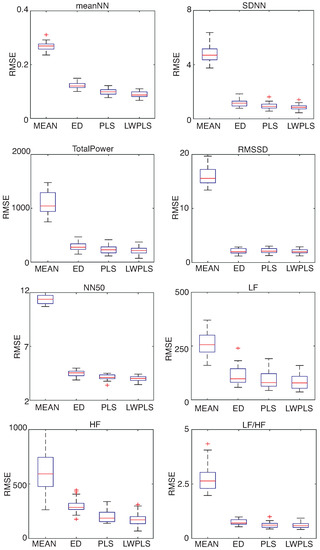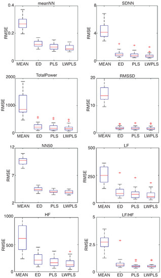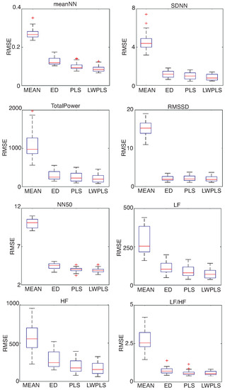 HRV features were derived from the RRI data interpolated by four methods. Figure 6, Figure 7 and Figure 8 show RMSEs of eight HRV features calculated by the interpolated RRIs through a simulation repeated 30 times. The proposed LWPLS-RI achieved the highest performance.