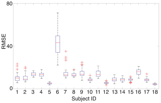 RMSE of RRI interpolation in each subject by LWPLS when . Although RMSEs of almost all subjects except Subject 6 were less than twenty, that of Subject 6 was more than forty.