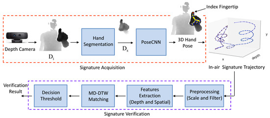 In-air signatures are a new modality which allows a user to sign in the air by making free hand movements, thereby eliminating the need for a writing surface. Notably, this modality inherently contains important information in the third dimension (i.e., depth), in addition to the 2D spatial pattern. Existing methods for in-air signature verification use either an RGB or depth camera, a wearable camera (e.g., Google Glass) or a movement sensor in a cell phone [1,16,17,18]. However, these methods address the problem of in-air signature acquisition and verification in the conventional way. More precisely, the focus of these approaches has been inclined towards the utilization of the 2D spatial and temporal features. Lack of consideration towards the hidden depth information has restricted the exploration of the full potential in the 3D signature trajectory. In this work, we investigate the potential of the unique depth pattern. We show that the depth itself is a strong feature, which is sufficient for in-air signature verification. On the other hand, fingertip tracking is a challenging problem, especially due to the occlusions of fingers and viewpoint changes during signing freely in the air. The acquisition of a correct in-air signature trajectory is crucial to verification. This problem has not been well-addressed because the existing approaches try to locate only the fingertip using heuristics. Some of the approaches rely on palm center point tracking [17,19] which does not accurately mimic the pointing finger movement while signing in the air. Furthermore, due to their complex in-air signature acquisition systems, they are not suitable for real-time applications. In principle, the skeleton of a human hand is a kinematic structure where each child joint is connected to its parent joints [20,21]. Therefore, for a stable and reliable tracking of the position of a fingertip, the complete 3D pose of a hand should be estimated. In contrast to existing fingertip-tracking approaches, we exploited the huge progress of the convolutional-neural-network (CNN) based hand pose estimation using a low cost multimodal depth sensor [22] and trained a CNN to estimate the hand joints’ keypoints in 3D; see Section 4.3. Estimating a full hand pose is more stable, especially in the case of occluded fingertips, as it learns to estimate all features of the hand. We created our own database of in-air signatures for analysis and verification. We performed a detailed ablation study, which especially reveals the significance of the hidden depth feature in verification. We propose an improved spatial-features-based verification strategy which incorporates the depth information; see Section 6.1. We employed the most common and effective multidimensional dynamic time warping (MD-DTW) algorithm for matching, since our focus is to investigate and highlight the potential in individual features of the in-air signature using the best practice for verification.