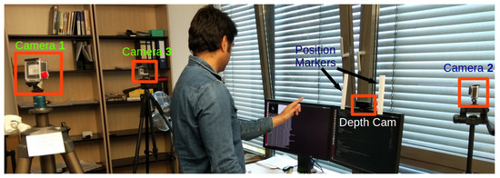 Our setup for in-air signature acquisition. The depth camera is mounted on top of the screen. The position markers on both sides of the depth camera allow capturing of in-air signature within the field of view (FoV) of the camera. Three GoPro cameras are placed around a user to record the hand motion in 3D space from different view points. Camera 3 specifically records the depth variation.
