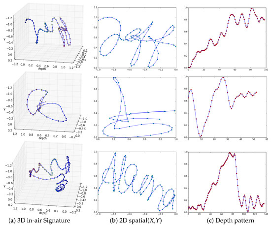 Samples of genuine in-air signatures from our dataset. Each one of the rows shows (a) the 3D in-air signature trajectory, (b) the 2D spatial view, and (c) depth pattern. The depth pattern of each signature is particularly unique and, therefore, it is an important hidden feature.