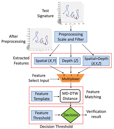 The flow diagram of the testing phase of our in-air signature verification system. The test signature is preprocessed for normalization and smoothing. The extracted features include spatial, depth, and spatial plus depth. Then, a multiplexer with a control input is used to select one of the extracted features. The selected feature is matched with the corresponding feature template using the MD-DTW algorithm. Finally, the verification result is produced by the decision threshold.