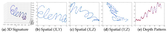 Figure 6 shows all the feature combinations we used in our verification process. We studied the impact of the hidden depth feature in different ways. The spatial (X,Y) is a commonly used 2D representation of in-air signatures; see Figure 6b. However, we argue that only the spatial (X,Y) is not a complete representative of an in-air signature trajectory. Therefore, we extracted two new types of spatial features, i.e., spatial (X,Z) and spatial (Y,Z) which implicitly incorporate the depth feature. We also studied the impact of these two features when combined with the spatial (X,Y); see Section 6. Nevertheless, the most interesting feature is the hidden depth pattern (Figure 6e) which has not been fully explored in the previous works.
