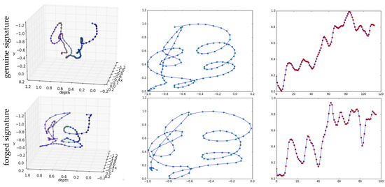 Electronic identity authentication plays a vital role for access control and security in modern age. In e-authentication, a protected token (e.g., a cryptographic key) is used to access a system or an application on a network. Biometric-based authentication uses physical, behavioral, or adhered human characteristics for identification. These characteristics include, for instance, a fingerprint, iris scan, handwritten signature, color, gait, and facial scan. Biometric authentication is more secure and less prone to identity theft [1]. With the rapid growth of technology, emerging concepts, such as classroom of the future http://iql-lab.de [2], would allow smart interactions in a virtual and augmented reality environment. In such a noncontact mode of interaction, biometric in-air signature verification is important for access control and authentication. Traditionally, signature verification methods are classified into two types, namely, offline and online signature verification. In offline signature verification, a handwritten signature is acquired on a document and verified using a scanned or camera-captured image of the 2D signature [3,4,5]. The artificial neural network (ANN), support vector machine (SVM), and pixel matching technique (PMT) are famous classification algorithms, which have been used by offline methods. On the other hand, in online methods, e-signatures are taken on a touch device (e.g., tablet or pad) using an e-pen or finger movement on a digital screen [6,7,8,9,10,11,12,13]. These methods are difficult to forge due to various dynamic features, such as velocity, acceleration, and pen pressure. The signature acquisition techniques mentioned above exploit the 2D spatial and temporal information taken from a digital touch screen or a document. For verification, dynamic time warping (DTW) is the most effective and widely used technique [14,15], mainly because of its ability to well align temporal signals. Other prominent approaches based on a. neural network (NN) [12], SVM [13], and the hidden Markov model (HMM) [9] have also been employed for online verification.