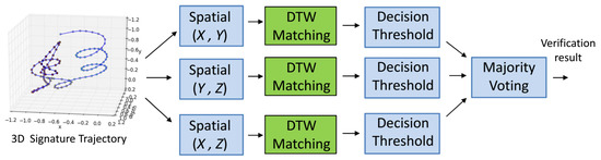 Our framework for an improved 2D spatial-based signature verification (ISSV) module. The spatial features (i.e., (X,Y), (Y,Z) and (X,Z)) are separately matched with the respective precomputed feature templates using a 2D-DTW algorithm. Thereafter, binary decisions are made by the decision thresholds. Lastly, the test signature is verified using a simple majority voting scheme.