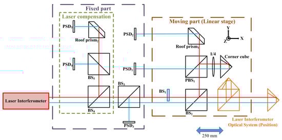The structure layout of the proposed measurement system for simultaneously measuring 6DOF geometric motion errors of a long linear stage is shown in Figure 1. The proposed measurement system consists of two parts, namely a moving part attached on the measured long linear stage and a fixed part. The proposed measurement system is constituted of a laser interferometer, five two-dimensional PSDs, five BSs, two roof prisms, and one corner cube. Among them, the PSD utilizes a silicon photodiode-based pincushion tetra lateral sensor (Newport, CA, USA, CONEX-PSD9, position sensitivity of 0.5 μm) to accurately measure the displacement of an incident beam relative to the calibrated center. Unlike quadrant detectors, the improved tetra-lateral effect diode is highly linear over the full sensor size. In the proposed approach, the commercial laser interferometer is combined into the proposed measurement system to measure the positioning error of the linear stage.