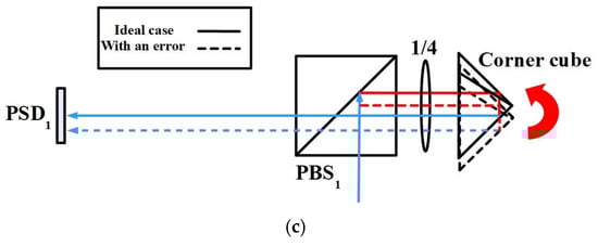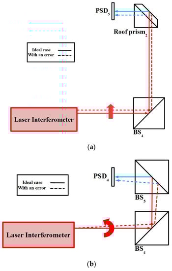 However, the timing fluctuations of the laser source introduce noise, thereby degrading the measurement accuracy [32,33,34,35]. As a result, this study proposes a method to measure and compensate for fluctuations in the laser beam geometry. As shown in Figure 3, two PSDs (PSD4 and PSD5) are used to measure linear fluctuations (δly and δlz) and angular fluctuations (εly and εlz) of the laser source in this study. As stated in Section 3, a forward light ray tracing method is used to follow the laser beam. From these data, the effects of 6DOF geometric errors of the linear stage on the light spot positions on the PSDs are determined, and a reverse derivation is applied to find the 6DOF geometric errors of the linear stage from the light spot position information [7]. Subsequently the measurement accuracy of the proposed measurement system can be improved by compensating the measured linear and angular fluctuations of the laser source. As a result, the 6DOF geometric errors of the linear stage can be obtained by analyzing the position information of the light spots on the PSDs and the optical paths in the proposed measurement system.