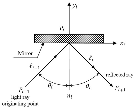 As shown in Figure 7, a laser beam originates from P i 1 = [ P i 1 x P i 1 y P i 1 z 1 ] T and is incident on a flat surface along the unit directional vector i 1 = [ i 1 x i 1 y i 1 z 0 ] T . When the ray impacts the flat surface, if λi is the vector from the source Pi − 1 to the destination point Pi, then λi is as follows: