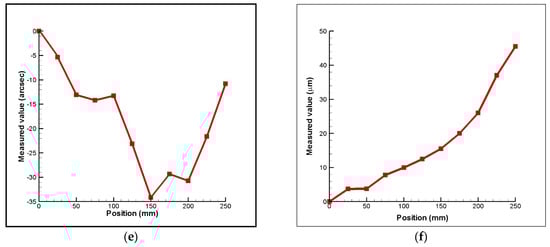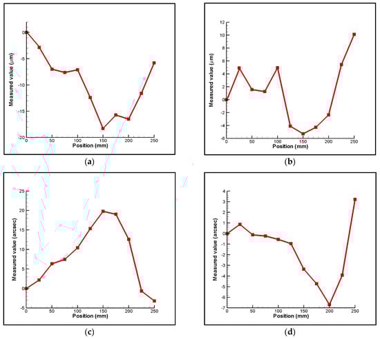 Figure 9. Experimental results for variation of geometric motion error with position: (a) horizontal straightness, (b) vertical straightness, (c) pitch, (d) yaw, (e) roll, and (f) positioning errors, respectively.