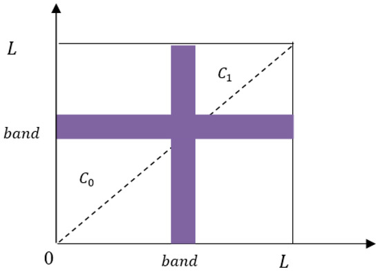 The band is in the range of [, ] and the image is divided into two categories, and , according to the threshold band. and are in the range of [0, and [, ], respectively. As shown in Figure 3, and correspond to the background and target, and other areas represent noise and edges.