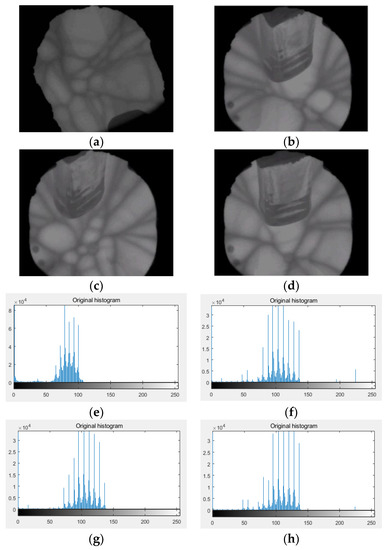 (a–d) are the original images of crystal growth images, (e–h) are the histograms of the original images.