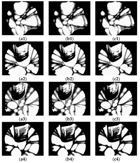 Segmented images obtained by the Otsu-based PSO, BF, and GA methods ((a1–a4, b1–b4, c1–c4) represent PSO, BF, and GA, respectively).
