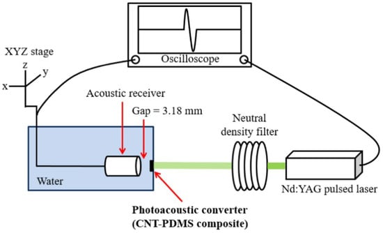 Here, for nanosecond optical pulse measurement, we used an Nd:YAG laser beam (532-nm wavelength, 6-ns pulse width, 10-Hz pulse repetition rate, 8-mm beam diameter; Litron Lasers, Rugby, UK) as an input to our sensor system (Figure 1). The laser beam was incident into the glass substrate side and then absorbed by the CNT-PDMS film (<20 μm thickness). The CNT-PDMS transmitter carries out photoacoustic conversion, which generates output ultrasound pulses transmitted via an acoustic impedance-matching medium (deionized water) to a piezoelectric receiver.