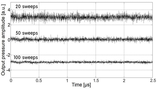 Background noise of the photoacoustic energy sensor (PES) system without pulsed laser irradiation. The noise level can be decreased by taking the average of greater numbers of sweeps.