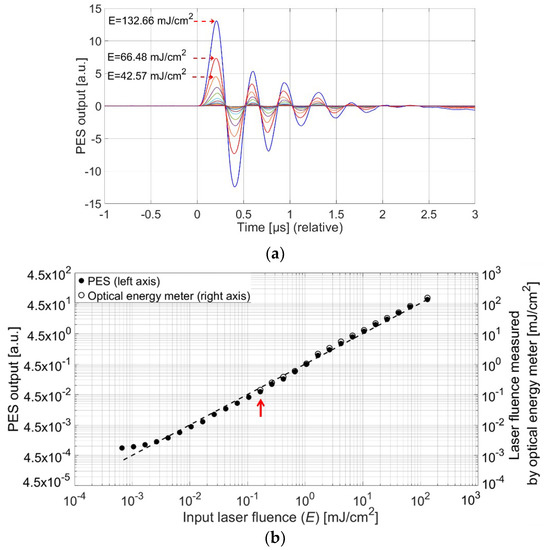 In Figure 3b, the PES output was obtained by integrating the acoustic vibration in time. In this characterization, the pulsed laser energy fluence at the exit of Nd:YAG laser beam was initially set to E0 = 264 mJ/cm2. Then, the input energy fluence (E) to the PES was decreased by placing additional neutral density filters at the exit of laser beam; E was reduced by 2-dB steps from −3 dB to −59 dB. Based on these conditions, E was calculated by n = 10logE/E0 where n is the attenuation by neutral density filters with a unit of dB, resulting in a range of 132 mJ/cm2–157 nJ/cm2. The input laser fluence calculated in this manner is given in Figure 3b. The incident pulsed laser energy fluence was then measured first by using the optical energy meter operated by heat accumulation. In this case, the minimum-measurable laser energy fluence was only 119.42 µJ/cm2 (denoted with the red arrow). Below this value, the energy fluence could not be accurately measured due to intrinsic thermal noise, resulting in signal fluctuations in time. However, the PES system allowed further measurement of signal amplitudes even down to 156.96 nJ/cm2. This corresponds to 1/760 of the minimum-measurable limit of the reference energy meter.