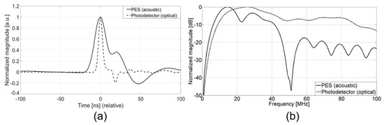 (a) Acoustic and optical waveforms measured by PES and high-speed photodetector. Both waveforms were normalized for pulse-width comparison. (b) Frequency spectra for the time-domain waveforms shown in (a).