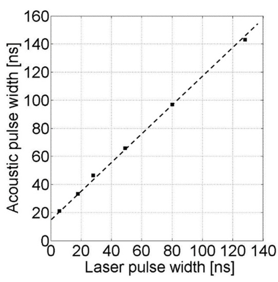 Although the acoustic receiver used in the current PES has such limited frequency bandwidth that causes pulse broadening in time domain, we could still find the relationship between temporal widths measured optically and acoustically (Figure 5). For a fixed CNT-PDMS transmitter placed in the PES system, the output acoustic pulse width should increase with that of the incident laser pulse. As shown in Figure 5, various optical pulse widths from 6 to 130 ns were given from the Q-switched Nd:YAG laser system. The dotted line shows a linear relationship between the incident optical pulse width measured by the high-speed photodetector and the output pulse width measured by the PES. The offset in the vertical axis (15.4 ns) is due to the pulse broadening effect in the PES that is caused by the fixed optical absorption thickness within the CNT-PDMS transmitter and the limited frequency bandwidth of the acoustic receiver. By subtracting this offset, we could exactly determine the laser pulse width over 6 to 130 ns. The offset may be further reduced by using a CNT-PDMS transmitter with a thinner CNT layer than the one used here. A CNT population more densely packed onto the substrate reduces the temporal broadening, making the measured acoustic pulse width close to the optical one [1]. However, this is not necessary because the incident laser pulse width can be retrieved as long as the thickness of CNT-PDMS transmitter in the PES is fixed. This demonstrates that the PES can be used for precise measurements of nanosecond optical pulse widths.