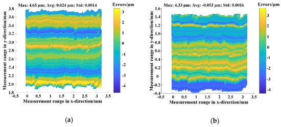 We also performed surface analysis of the high- and low-level point cloud data of the step masters whose height differences were 300 and 100 µm. For each level, a plane fitting operation was carried out, and then the fitted plane was subtracted from the measured point cloud to obtain the error distribution. The results along with the corresponding maximum absolute errors, average errors and standard deviations were shown in Figure 5. Here, Figure 5a,b show the error distributions of high- and low-level point cloud data of the 300 µm step master, and Figure 5c,d show those of the 100 µm step master. Although the maximum absolute errors were at most 4.88 µm, the average errors were all in the sub-micron range, and the standard deviations were about 0.1%. This means that the error distribution was relatively even in each level and the proposed method had a sub-micron measurement accuracy in the plane and high measurement reliability. The major sources of these errors could come from the roughness of the surfaces, the random noise of the cameras, and the error transfer during measurement (such as calibration, matching, reconstruction, etc.).