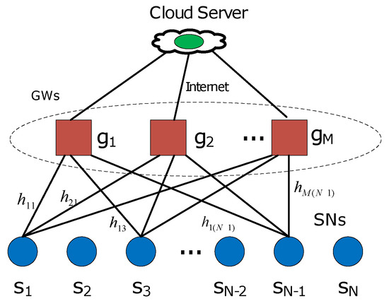 We consider a scenario with N SNs with the same transmit power and modulation scheme. The SNs are randomly located in a monitoring region with M deployed GWs that collect the data from the SNs.