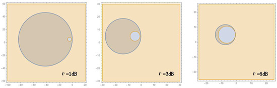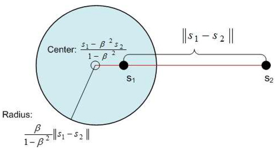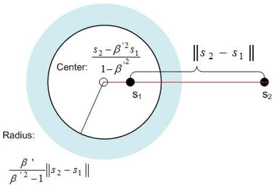 According to Equation (22), for , it is obvious that . Furthermore, because , then, , and . Therefore, and this means one circle will be inside of another circle.