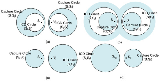 Based on the same idea from Equation (22), for , then . Because , then, , and . Therefore, and there is no intersection between the capture circle and the ICD circle, as shown in Figure 4c,d for different capture order by and .