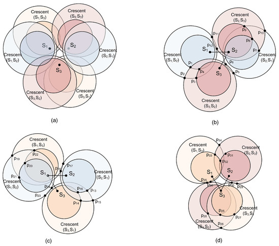 Crescent of each pair of SNs and location of 3 SNs and 2 GWs. The crescent region where the GW can decode both collided packets sent by the pair of SNs with capture effect and IC method, are shown in (a). In (b–d), the OPs are generated by the crescents corresponding to groups of sensor pairs and , and , and , and and and , and , respectively, such as in (b).