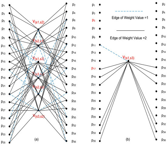 Example of the suggested WBG Algorithm with 3 SNs and GWs. (a) shows the complete bipartite graph, where and . The weights of the edges joining and and joining and are 1 and 2, respectively, as shown in (b).