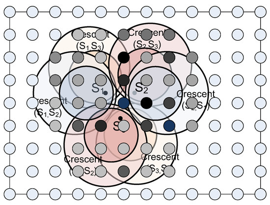 We now walk through the WBG algorithm (Algorithm 1) for an example of three SNs and two GWs, when , as illustrated in Figure 7. The capture circle and ICD circle for any ordered pair of SNs are calculated and we get the crescent region where the GW can decode both collided packets sent by the pair of SNs with capture effect and IC method, as shown in Figure 7a. In Figure 7b–d, the OPs are generated by the crescents corresponding to groups of sensor pairs and , and , and , and and and , and , respectively, such as in Figure 7b. Because there are too many OPs in the example, some of them are omitted here. As an example of weight calculation, in Figure 7b is on the boundary of two decoding crescents, which gives two edges each with weight . can also be located (it is not labeled) in Figure 7a, where it can be seen that is strictly inside the ICD circle of and also inside the capture circle of . Therefore, gains an additional weight of , for total weight of .