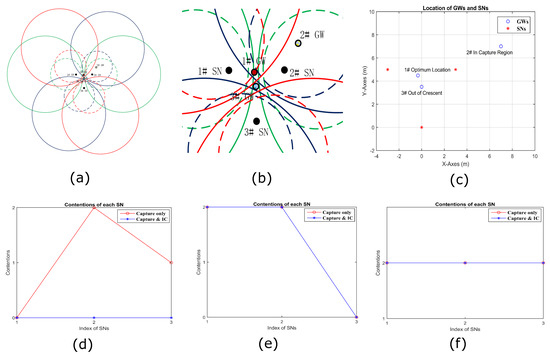 The GW in Figure 10a,b, the blue-filled circle in the very center, is outside of all capture circles. Thus, the contention of each SN is 2, as shown in Figure 10f, i.e., none of packets transmitted by any SN can be decoded successfully in a two-way collision, whether by only capture or capture with IC.